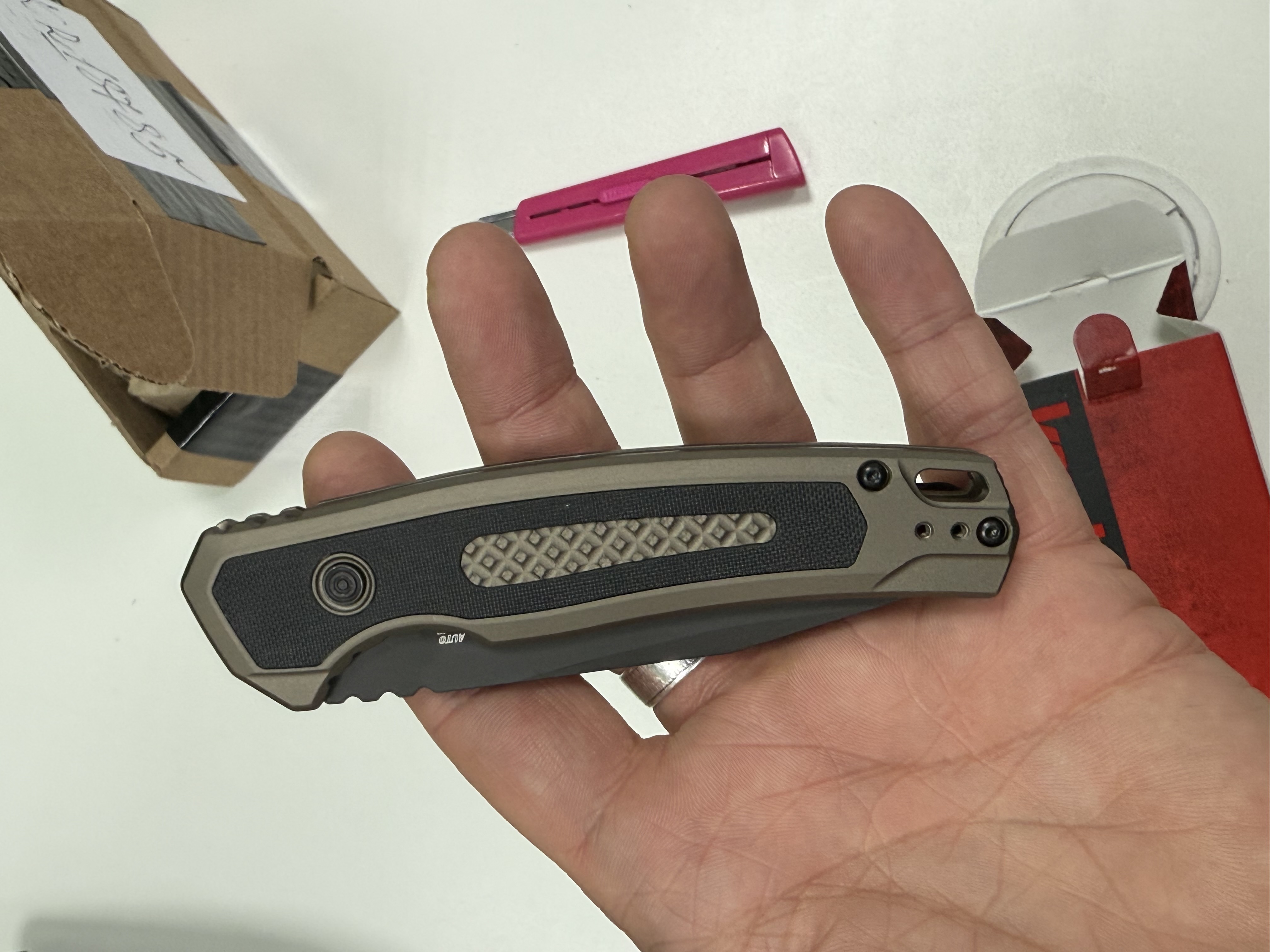 Нож великолепен! Идеальная подгонка, автомат просто бомба! Бреет! цвет просто нереальный, при разном освещении разный оттенок , медный и хаки!!!